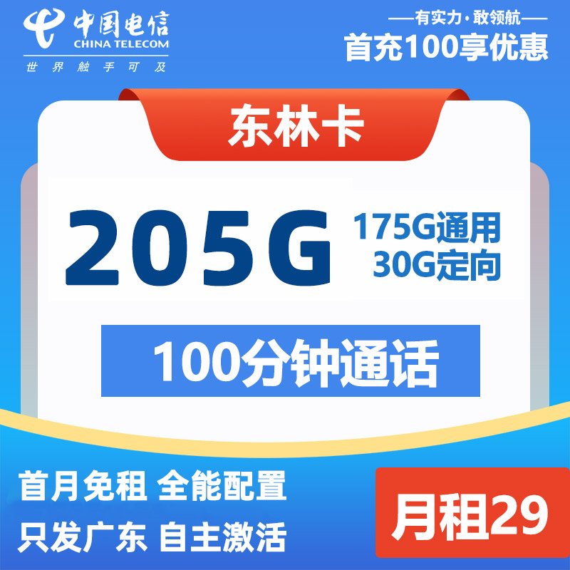 【广东专属】电信东林卡 29元/月205G全国通用流量+100分钟