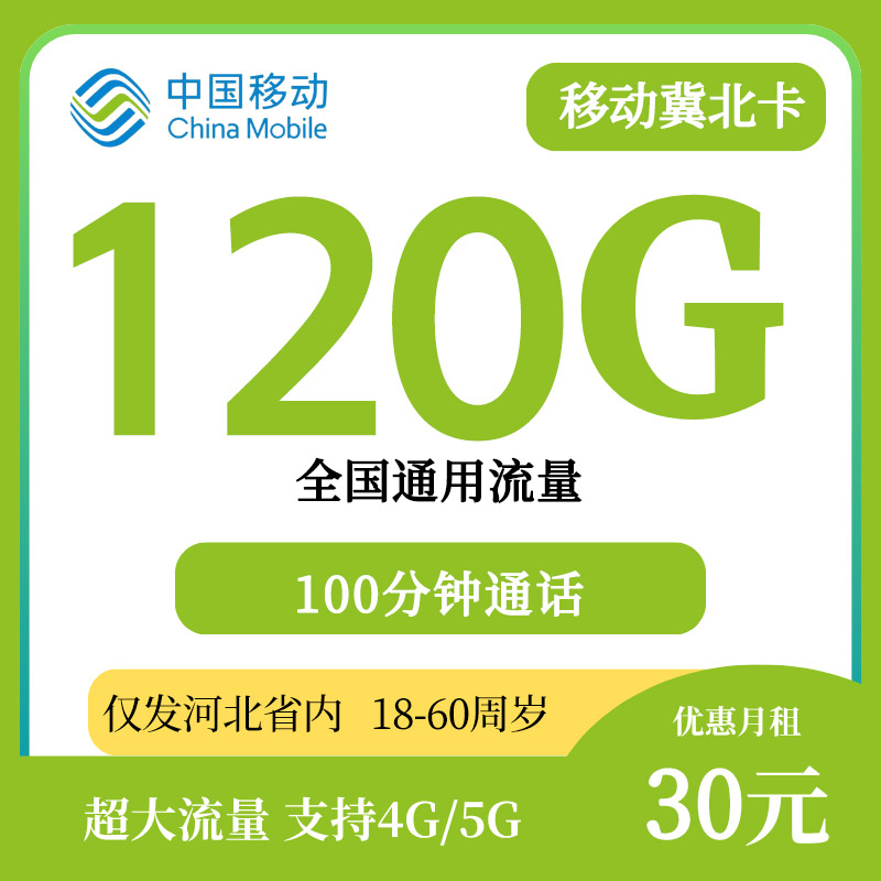 【河北专属】移动冀北卡 30元/月120G全国通用+100分钟通话