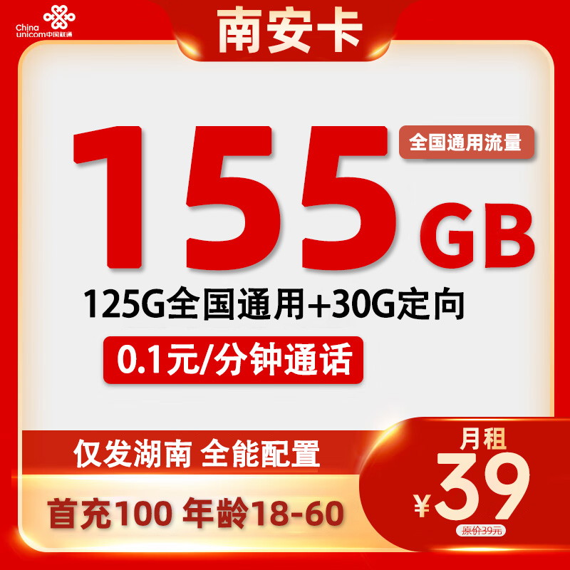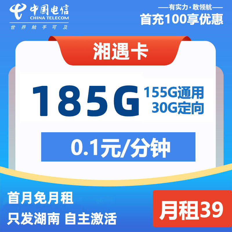 【湖南专属】电信湘遇卡 39元/月185G全国通用流量