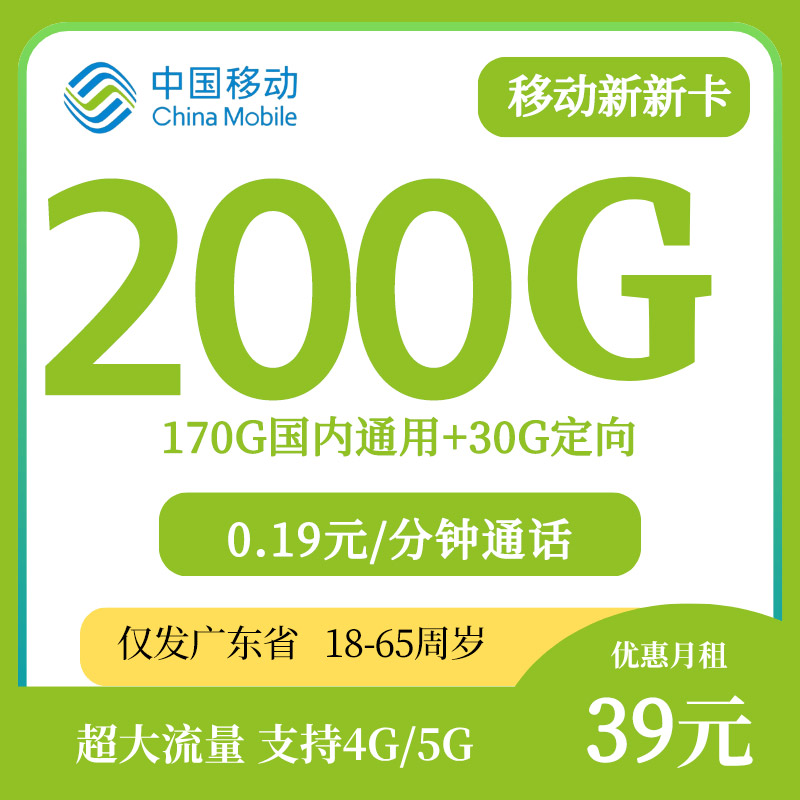 【广东专属】移动新新卡39元/月享200G全国通用流量