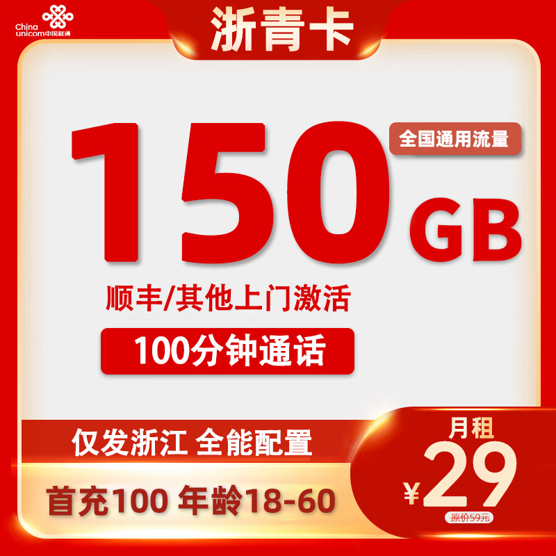 【浙江专属】联通浙青卡29元/月150G通用流量+100分钟通话