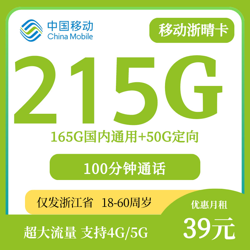 【浙江专属】移动浙晴卡39元215G全国通用流量+100分钟通话