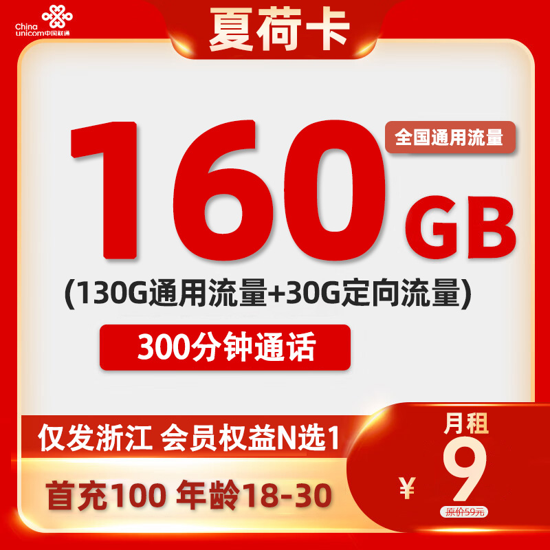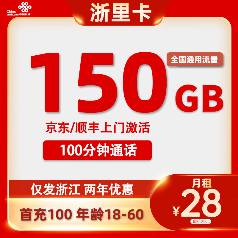 【浙江专属】联通浙里卡29元/月150G通用流量+100分钟通话