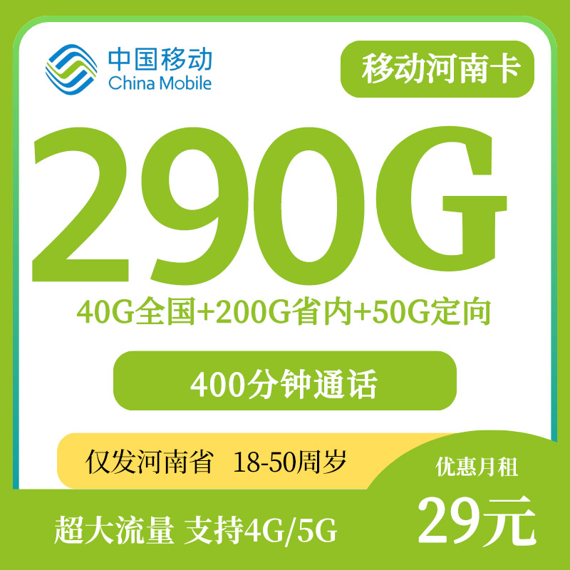 【河南专属】移动河南卡29元40G全国通用+200G省内通用+50G定向流量+400分钟通话